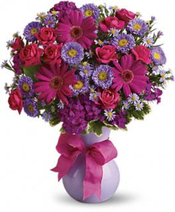 A joyful jubilee of lots (and lots!) of flowers. From hot pink roses to purple daisies to dark pink Sweet William, this colorful collection of blooms is a birthday favorite!